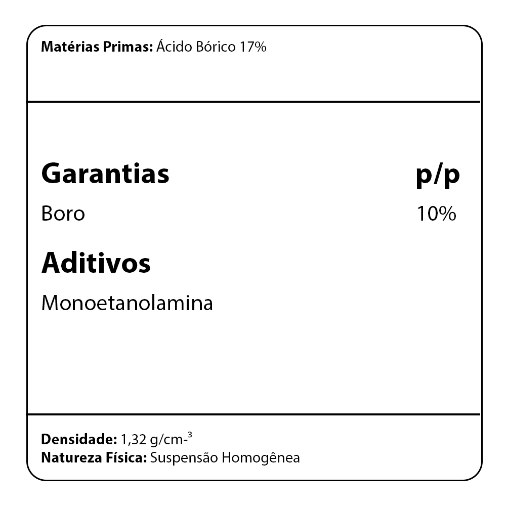 Este fertilizante especial é formulado com alta concentração de Boro complexado com MEA, garantindo rápida absorção e aproveitamento do nutriente pela planta. É ideal para fases de maior exigência nutricional, promovendo florescimento saudável, melhor pegamento e maior qualidade dos frutos e grãos.