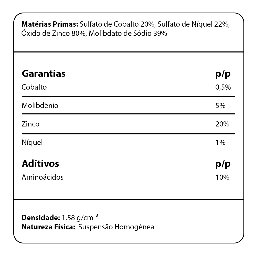 Fertilizante Especial desenvolvido à base de Cobalto, Molibdênio, Níquel e Zinco, indicado para tratamento de sementes e pulverização foliar. Proporciona suporte essencial para o desenvolvimento inicial das plantas e melhora a eficiência nutricional.